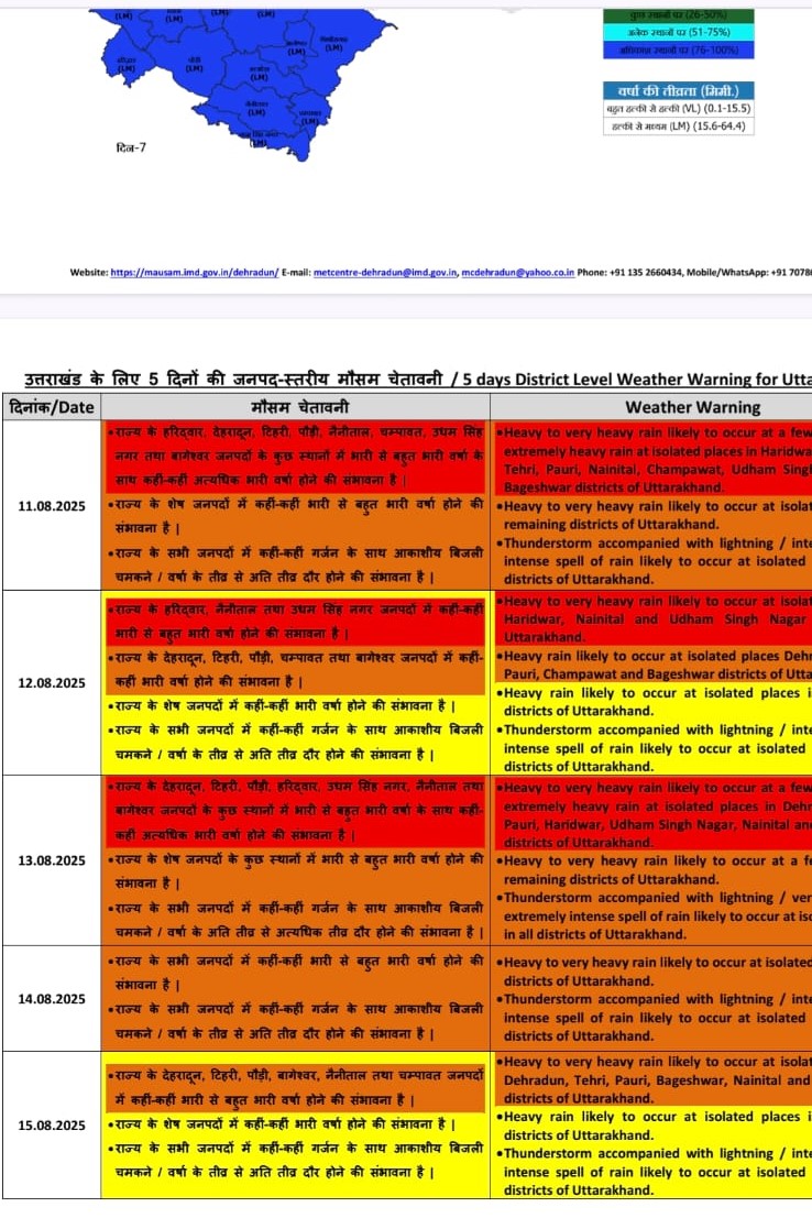 उत्तराखंड के अधिकांश जनपदो मे आज भारी बारिश का अलर्ट