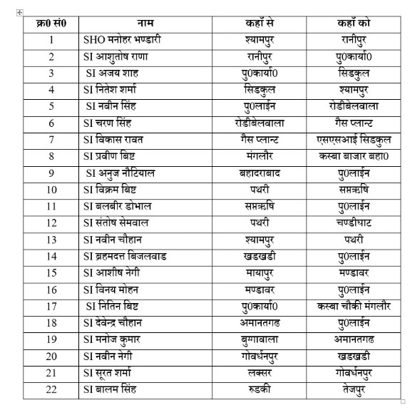 पथरी थाने से संतोष सेमवाल को चंडी घाट चौकी प्रभारी बनाया गया है, जबकि वहां तैनात नवीन चौहान को थाना पथरी भेजा गया है। खड़खड़ी चौकी प्रभारी ब्रह्मदत्त बिजलवाण सहित कई अन्य अधिकारियों का भी स्थानांतरण पुलिस लाइन कर दिया गया है। मायापुर चौकी प्रभारी आशीष नेगी को अब मंडावर (कोतवाली भगवानपुर) का प्रभारी बनाया गया है, जबकि विनय मोहन को पुलिस लाइन भेजा गया है।